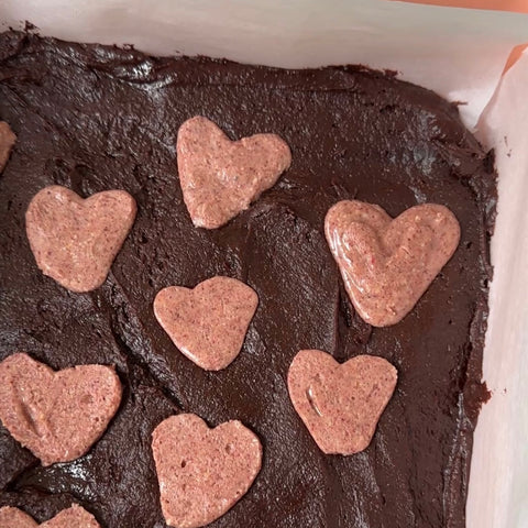 Remove nut butter shapes from the freezer, peel off the parchment, and place evenly throughout the top of the brownie batter.