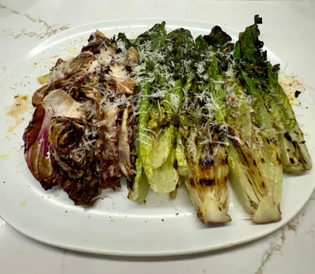 Prepare grill at medium high heat with clean grates. Whisk oil, vinegar, garlic, and crushed red pepper in small bowl. Brush lettuce liberally with olive oil mixture, leaving a little for reserve. Place radicchio and romaine on grill; sprinkle with kosher salt and fresh cracked pepper. Grill lettuce until edges are crisp and slightly charred, turning occasionally, about 6 minutes, pressing down with tongs to ensure a good sear. Transfer to serving platter. Drizzle with reserved marinade and sprinkle with cheese shavings.
