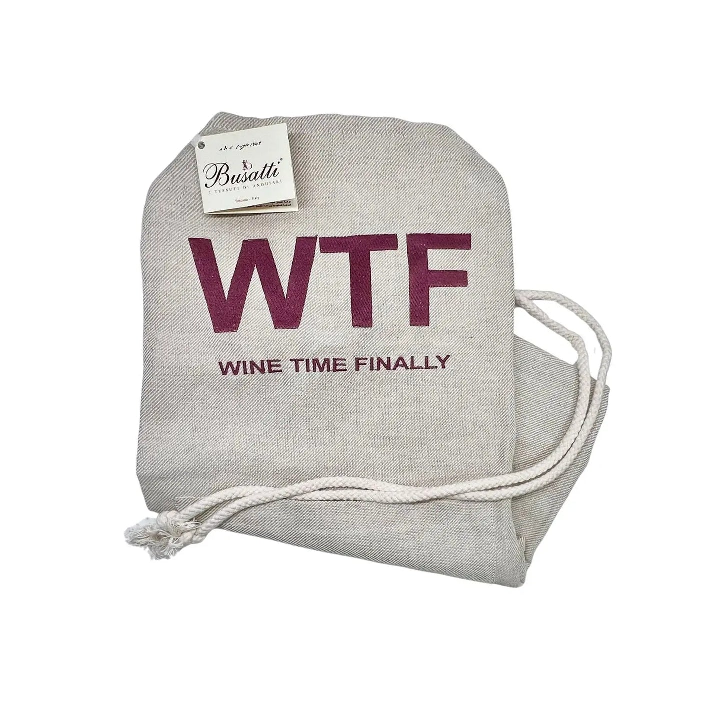 This apron, made out of the classic Zodiaco fabric in taupe, is accompanied by maroon colored embroidery WTF-Wine Time Finally and a large front pocket, and is finished with a vigorous, adjustable, cotton twisted cord. It is sure to bring laughter and meaningful, or meaningless conversation to your kitchen...dependant upon whether it is Wine Time Finally!