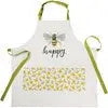 A cotton polyester blend apron featuring a bee illustration with a "Happy" sentiment. Includes a front pocket with an all-over floral design. Features adjustable straps. Machine washable.
