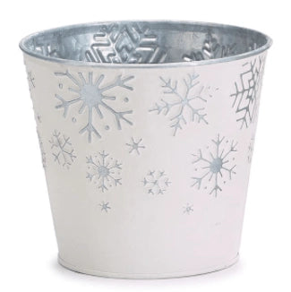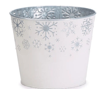 White tin with raised snowflakes brushed in silver. Hand-painted embossed tin. Comes with PVC liners.