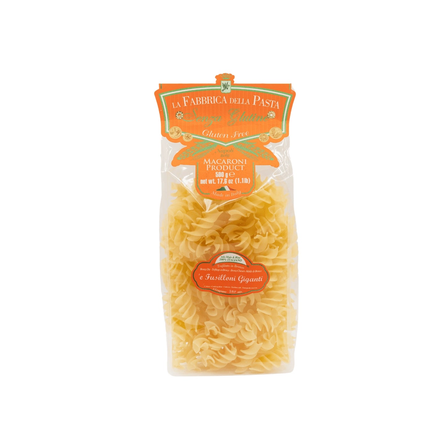 Gluten free fusilloni giganti are oversized fusilli noodles, as fun to eat as they are to prepare! Serve with your favorite homemade or store-bought pasta sauce. La fabbrica della pasta is the first pasta factory in the world to make a bronze-drawn, artisanal pasta of gragnano, that is completely gluten free. Made with the best rice and corn flour available and local spring water, bronze-drawn and slow-dried at a low temperature, this is true artisanal pasta from gragnano. It has wonderful flavor and bite, maintaining its firmness after cooking. Use as you would any quality dry pasta. All of la fabbrica della pasta's gluten free products are made with special care in a separate, completely gluten-free facility to protect from any cross contamination.