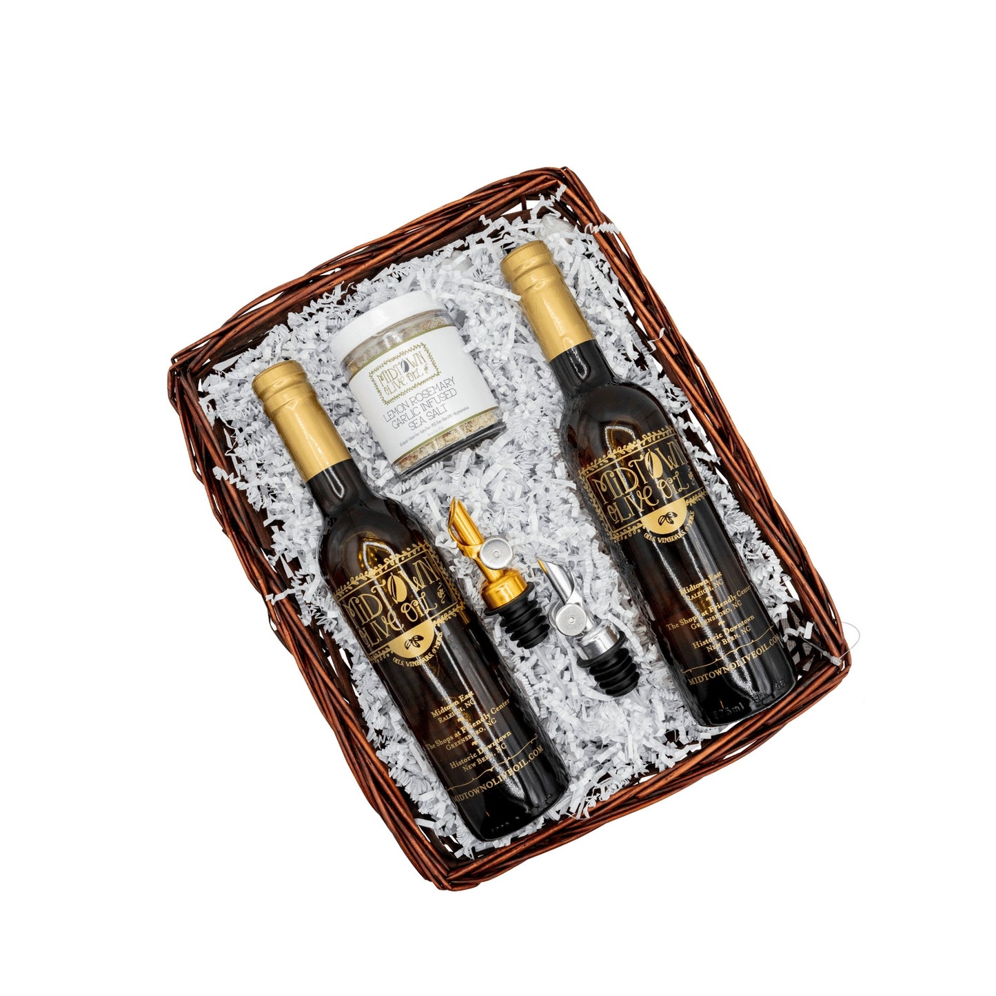A true homage to lemons, and their essential role in the kitchen. One of our best-selling Ultra Premium Extra Virgin Olive Oils is paired with Sicilian Lemon White Baslamic Vinegar. They can be using separately or in tandem to create the perfect creamy vinaigrette (recipe included). Adding flavor flare is our private label Lemon Garlic Rosemary Infused Sea Salt blend + we've added two self-closing pour spouts to jazz up the bottles. Our 375 ml bottles are used in this perfectly wrapped gift. Topped with a handmade bow, you can't go wrong!